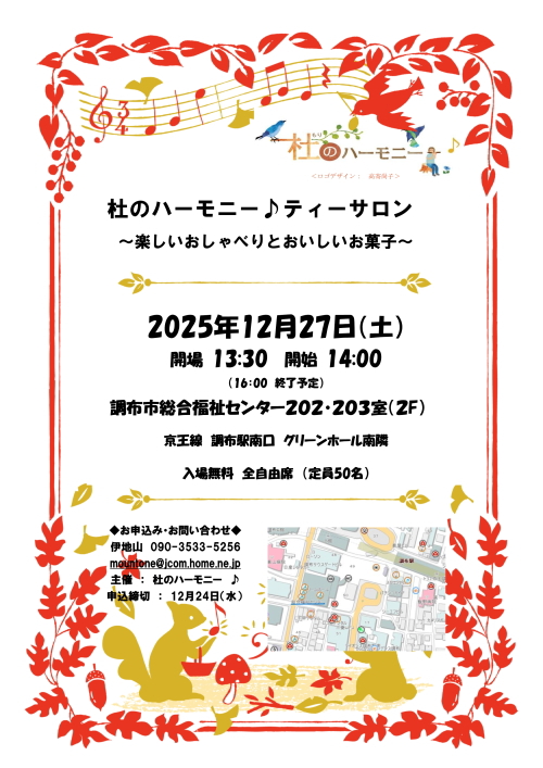杜のハーモニー♪ティーサロン ~楽しいおしゃべりとおいしいお菓子~ 2025年12月27日(土) 開場13:30開始14:00 (16:00終了予定) 調布市総合福祉センター202・203室(2F) 京王線 調布駅南口 グリーンホール南隣 入場無料 全自由席(定員50名) ◆お申込み・お問い合わせ◆ 伊地山 090-3533-5256 mountone@jcom.home.ne.jp 主催:杜のハーモニー♪ 申込締切:12月24日(水) 暮れのひと時、皆さまと歌い、おしゃべりしましょう。 おいしいお菓子もご用意します。 ご参加くださ~い。